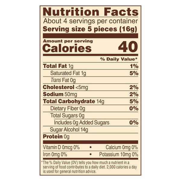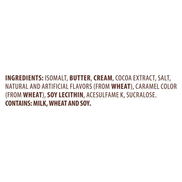 Isomalt, Butter, Cream, Cocoa Extract, Salt, Artificial Flavor, Ammonia Caramel Color, Soy Lecithin Emulsifier, Acesulfame-k And Sucralose Sweetener.