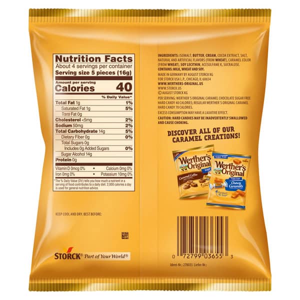 Werther’s Original Sugar Free Hard Chocolate Caramel Candies are decadently creamy hard caramel candies swirled with the flavor of rich, sweet chocolate. Enjoy a sweet treat with Werther’s Original Sugar Free Caramel Hard Candies. They melt smoothly in your mouth, leaving a buttery sweet taste that lingers. Werther’s Original Sugar Free caramel candy has all the delicious buttery and creamy flavor of Werther’s Original without the sugar. Werther’s Original is made with only the finest ingredients blended together with the same passion and care our first candy maker, Gustav Nebel, brought to every candy he crafted. Made with real butter and fresh cream, for a one of a kind taste. One 2.35 oz bag of Werther’s Original Caramel Candy