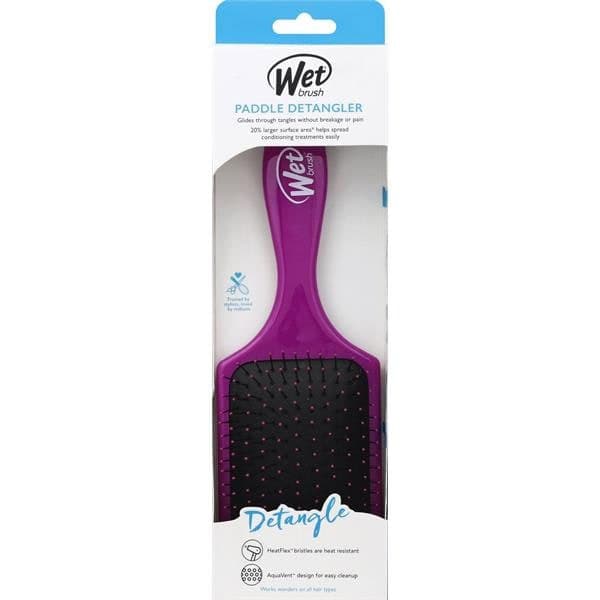 Glides through tangles without breakage or pain. 20% larger surface are (Compared to Original Detangler) helps spread conditioning treatments easily. Trusted by stylist, loved by millions. HeatFlex bristles are heat resistant. AquaVent design for easy cleanup. Works wonders on all hair types. Meet the Paddle Detangler Spreads conditioning treatments and hair masks with easy brush cleanup for your at-home spa day Not only does the Paddle Detangler gently loosen knots without pulling or breaking your hair. it’s also a great tool for brushing through conditioning treatments and hair masks, The vented design makes it easy for water and excess product to escape the brush, so there’s no leftover build-up and clean-up is a breeze Just rinse it and repeat. Heatflex bristles are heat resistant to detangle while you blow dry. AquaVent design allows for fast drainage and easy cleanup. 20% larger surface area’ helps to spread conditioning treatments and hair masks evenly throughout hair. Bristles glide through tangles with ease for less pain and breakage. thewetbrush.com. Facebook. Twitter. Instagram. Pinterest. Recyclable: Paperboard packaging. Made in China.