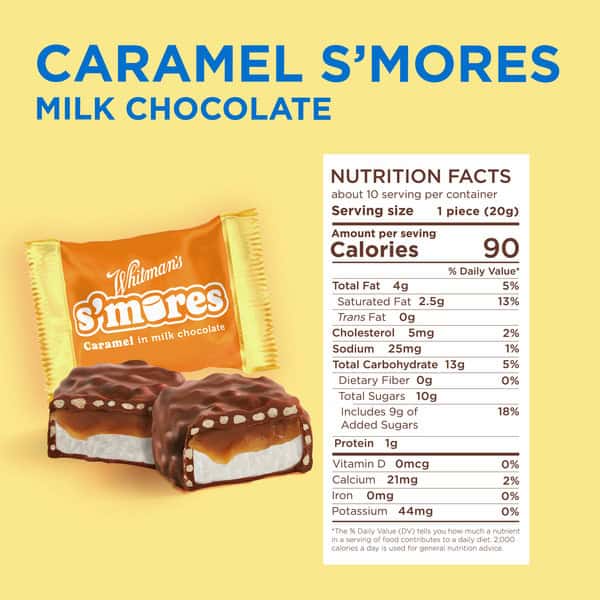 • WHITMAN’S Caramel S’Mores chocolate candy bars combine fluffy marshmallow, rich, chewy caramel, crunchy graham cracker flavored pieces and smooth milk chocolate for a taste you will FALL in love with!