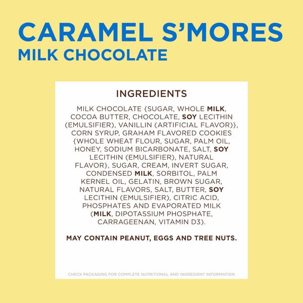 Milk Chocolate {sugar, Whole Milk, Cocoa Butter, Chocolate, Soy Lecithin (emulsifier), Vanillin (artificial Flavor)}, Corn Syrup, Graham Flavored Cookies {whole Wheat Flour, Sugar, Palm Oil, Honey, Sodium Bicarbonate, Salt, Soy Lecithin (emulsifier), Natural Flavor}, Sugar, Cream, Invert Sugar, Condensed Milk, Sorbitol, Palm Kernel Oil Gelatin, Brown Sugar, Natural Flavors, Salt, Butter Soy Lecithin (emulsifier), Citric Acid, Phosphates And Evaporated Milk (milk, Dipotassium Phosphate, Carrageenan, Vitamin D3)