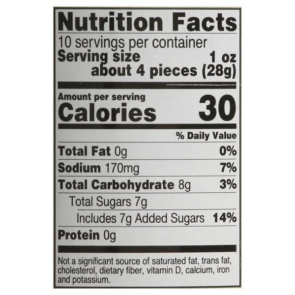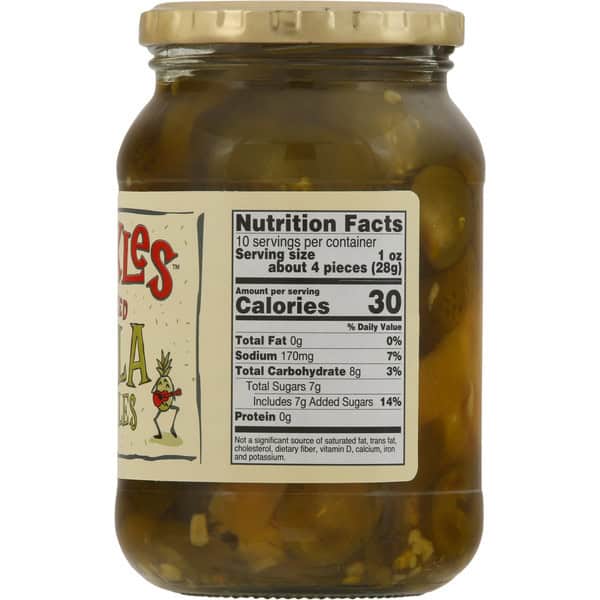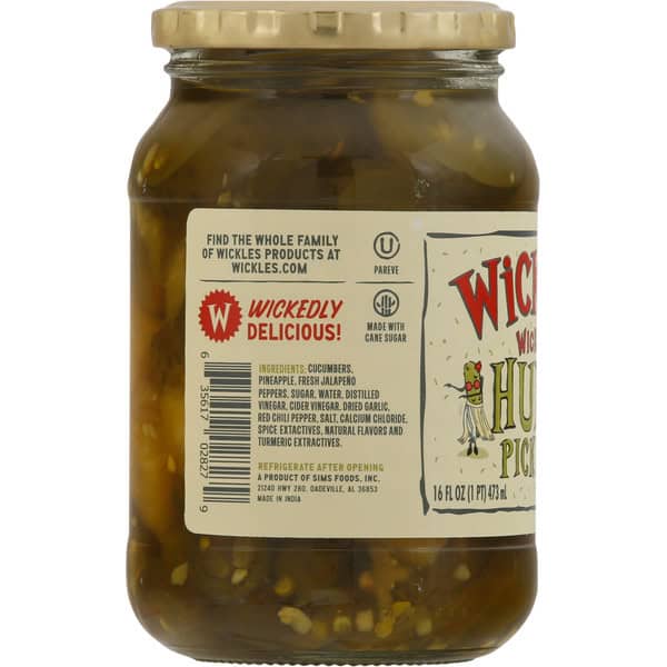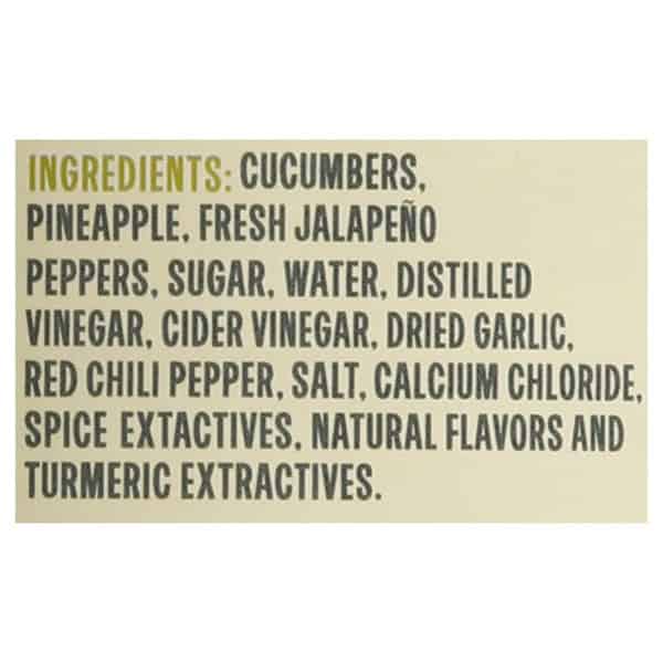 Cucumbers, Pineapple, Fresh Jalapeno Peppers, Sugar, Water, Distilled Vinegar, Cider Vinegar, Dried Garlic Red Chili Pepper, Salt, Calcium Chloride, Spice Extactives, Natural Flavors And Turmeric Extractives.