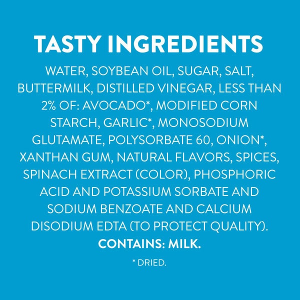 Water, Soybean Oil, Sugar, Salt, Buttermilk, Less Than 2% Of: Distilled Vinegar, Modified Corn Starch, Monosodium Glutamate, Garlic*, Avocado*, Polysorbate 60, Onion*, Xanthan Gum, Natural Flavors, Spices, Spinach Extract (color), Phosphoric Acid And Potassium Sorbate And Sodium Benzoate And Calcium Disodium Edta (to Protect Quality).