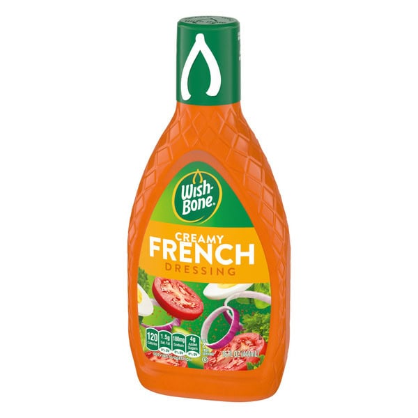 Wish-Bone Creamy French Dressing adds bold flavor to your favorite recipes. Tomatoes, classic herbs and spices, and vinegar make this French salad dressing irresistible. This slightly sweet and tangy salad dressing delivers great texture and flavor to all your dishes. Not only is this creamy salad dressing made without high fructose corn syrup, but it also contains no artificial flavors. Pour this French salad dressing over fresh salads, use it in sandwiches or serve it as a dip. A 15 fluid ounce squeeze salad dressing bottle makes it easy to dispense the perfect amount. Refrigerate the dressing after opening. From creamy French to robust Italian dressings, Wish-Bone has what you need to make your dishes amazing.