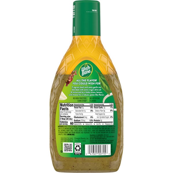 Wish-Bone Extra Virgin Olive Oil Blend Garlic Basil Italian Dressing adds delicious flavor to your favorite recipes. Made with extra virgin olive oil and flavors of basil, garlic and Romano cheese to make this dressing irresistible. This Italian salad dressing dressing mixes easily, adding great flavor to every bite. Not only is this salad dressing made without high fructose corn syrup, but it contains no trans fat and zero cholesterol. Wish-Bone Extra Virgin Olive Oil Blend Garlic Basil Italian Dressing is ideal for mixing into pasta salads, pouring over fresh salads or using as a marinade. A 15 fluid ounce squeeze salad dressing bottle makes it easy to dispense the perfect amount. From robust Italian dressings to creamy ranch, Wish-Bone has what you need to make your dishes amazing.