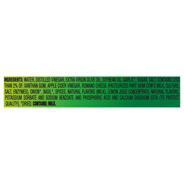 Water, Distilled Vinegar, Extra Virgin Olive Oil, Soybean Oil, Garlic*, Sugar, Salt, Contains Less Than 2% Of: Xanthan Gum, Apple Cider Vinegar, Romano Cheese (pasteurized Part Skim Cow’s Milk, Culture, Salt, Enzymes), Onion*, Basil*, Spices, Natural Flavors (milk), Lemon Juice Concentrate, Natural Flavors, Potassium Sorbate And Sodium Benzoate And Phosphoric Acid And Calcium Disodium Edta (to Protect Quality). *dried.