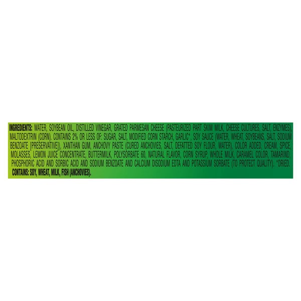 Water, Soybean Oil, Distilled Vinegar, Grated Parmesan Cheese (pasteurized Part Skim Milk, Cheese Cultures, Salt, Enzymes), Maltodextrin (corn), Contains 2% Or Less Of: Sugar, Salt, Modified Corn Starch, Garlic*, Soy Sauce (water, Wheat, Soybeans, Salt, Sodium Benzoate [preservatives]), Xanthan Gum, Anchovy Paste (cured Anchovies, Salt, Defeated Soy Flour, Water), Color Added, Cream, Spice, Molasses, Lemon Juice Concentrate, Buttermilk, Polysorbate 60, Natural Flavors, Corn Syrup, Whole Milk, Caramel Color, Tamarind, Phosphoric Acid And Sorbic Acid And Sodium Benzoate And Calcium Disodium Edta And Potassium Sorbate (to Protect Quality), *dried