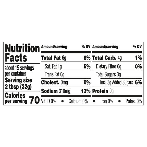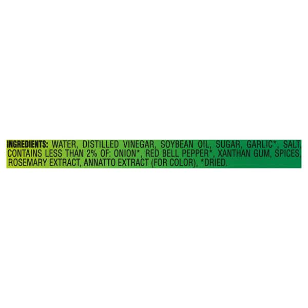 Water, Distilled Vinegar, Soybean Oil, Sugar, Garlic*, Salt, Contains Less Than 2% Of: Onion*, Red Bell Pepper*, Xanthan Gum, Spices, Rosemary Extract, Annatto Extract (for Color),