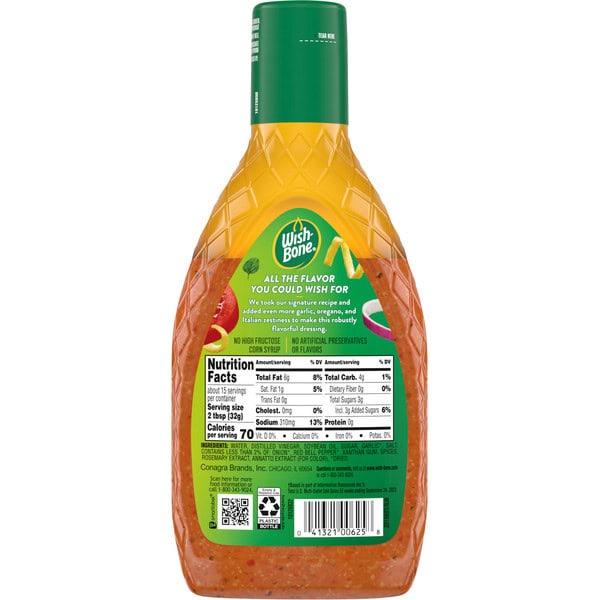No.1 Italian dressing brand (Based in part of Information Resources Inc.’s total US multi-outlet unit sales 52 weeks ending March 3, 2019). All the flavor you could wish for. We took our signature recipe and added even more garlic, oregano, and Italian zestiness to make this robustly flavorful dressing. No high fructose corn syrup.