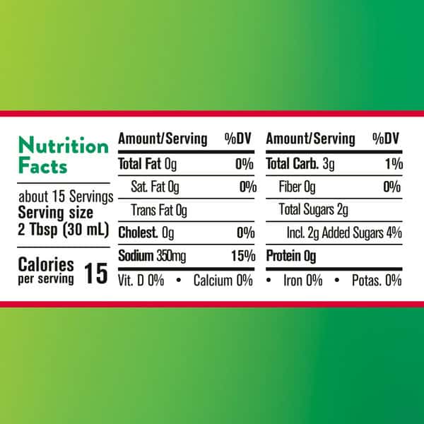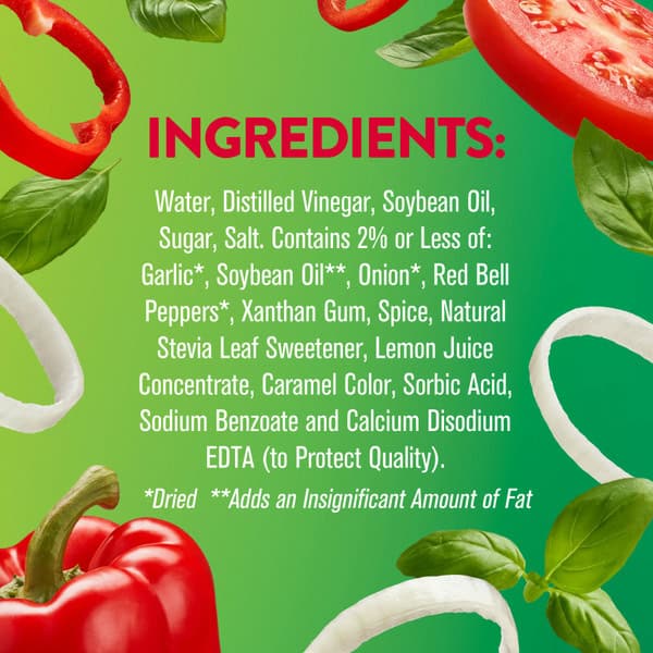 Water, Distilled Vinegar, Sugar, Salt, Contains Less Than 2% Of: Garlic*, Soybean Oil** Onion*, Xanthan Gum, Red Bell Pepper*, Spices, Stevia Leaf Extract (rebaudioside A), Lemon Juice Concentrate, Caramel Color, Sorbic Acid And Sodium Benzoate And Calcium Disodium Edta. (to Protect Quality.) *dried **adds An Insignificant Amount Of Fat