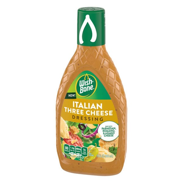 Wish-Bone Italian Three Cheese Dressing adds bold flavor to all your favorite dishes. Made with Parmesan, Asiago and Romano cheeses, this classic Italian dressing adds a flourish of flavor to marinades, pasta salads and more. Wish-Bone Italian salad dressing mixes into your salad easily, providing robust flavor in every bite. Not only is Wish-Bone Italian Salad Dressing full of bold flavor, but it is made with no high fructose corn syrup and no artificial flavors. This dressing complements a variety of salads, adds flavor to a chicken marinade, and is tasty with beef or a side of vegetables. The dressing is packaged in a squeeze salad dressing bottle to make it easy to dispense the perfect amount. Refrigerate the dressing after opening. From robust Italian dressings to sweet vinaigrettes, Wish-Bone has what you need to make your dishes amazing.