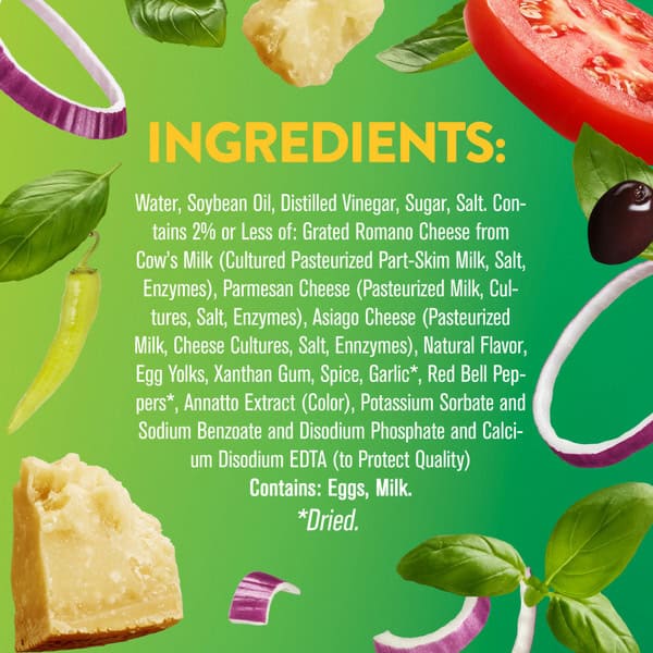 Water, Soybean Oil, Distilled Vinegar, Sugar, Salt, Less Than 2% Of: Asiago Cheese (pasteurized Milk, Cheese Cultures, Salt, Enzymes), Romano Cheese (pasteurized Part Skim Cow’s Milk, Culture, Salt, Enzymes), Parmesan Cheese (pasteurized Part Skim Milk, Cheese Cultures, Salt, Enzymes), Xanthan Gum, Egg Yolks, Spices, Natural Flavors, Garlic*, Red Bell Pepper*, Annatto Extract (color), Potassium Sorbate And Sodium Benzoate And Calcium Disodium Edta (to Protect Quality).