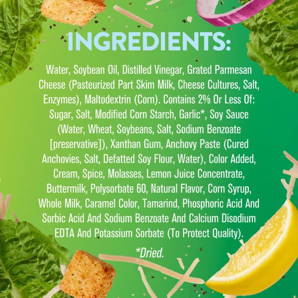 Water, Soybean Oil, Distilled Vinegar, Grated Parmesan Cheese (pasteurized Part Skim Milk, Cheese Cultures, Salt, Enzymes), Maltodextrin (corn). Contains 2% Or Less Of: Sugar, Salt, Modified Corn Starch, Garlic*, Soy Sauce (water, Wheat, Soybeans, Salt, Sodium Benzoate [preservative]), Xanthan Gum, Anchovy Paste (cured Anchovies, Salt, Defatted Soy Flour, Water), Color Added, Cream, Spice, Molasses, Lemon Juice Concentrate, Buttermilk, Polysorbate 60, Natural Flavor, Corn Syrup, Whole Milk, Caramel Color, Tamarind, Phosphoric Acid And Sorbic Acid And Sodium Benzoate And Calcium Disodium Edta And Potassium Sorbate (to Protect Quality).