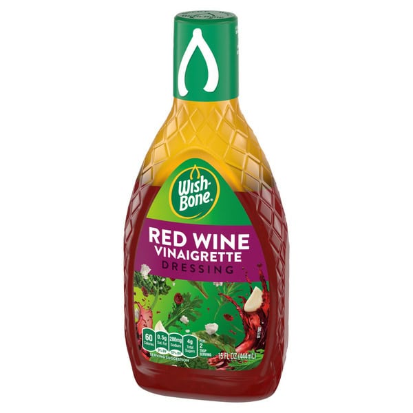 Wish-Bone Red Wine Vinaigrette Dressing adds indulgent flavor to all your favorite recipes. Made with mellow red wine vinegar, a splash of Cabernet Savignon, and the perfect hint of garlic, this salad dressing vinaigrette is bright and refreshing. A lighter texture means this red wine vinegar dressing mixes easily into salads for rich flavor in every bite. This red wine vinaigrette salad dressing contains no high fructose corn syrup and is made without artificial flavors. Wish-Bone Red Wine Vinaigrette Dressing complements a variety of salads and serves as a delicious marinade for pork and chicken. The dressing is packaged in a convenient 15 fluid ounce squeeze bottle, making it easy to dispense the perfect amount. Refrigerate the dressing after opening. From savory vinaigrettes to creamy ranch dressings, Wish-Bone has what you need to make your dishes amazing.