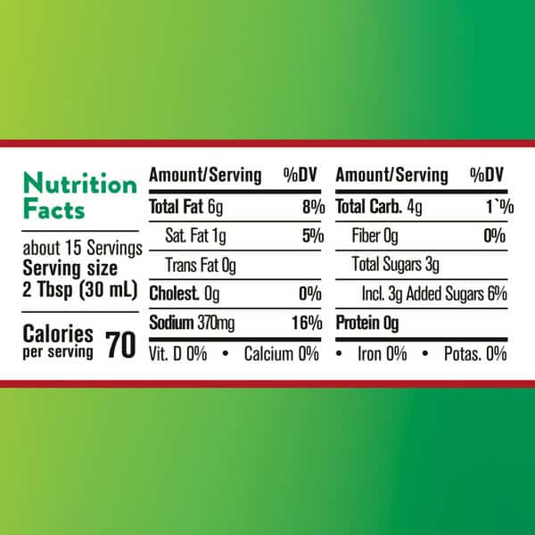 Water, Distilled Vinegar, Soybean Oil, Sugar, Garlic*, Salt, Contains Less Than 2% Of: Onion*, Red Bell Pepper*, Xanthan Gum, Spices, Rosemary Extract, Annatto Extract (for Color), *dried.
