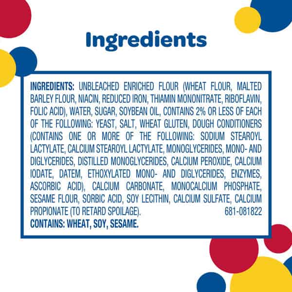 Unbleached Enriched Flour (wheat Flour, Malted Barley Flour, Niacin, Reduced Iron, Thiamin Mononitrate, Riboflavin, Folic Acid), Water, High Fructose Corn Syrup, Soybean Oil, Contains 2% Or Less Of Each Of The Following: Yeast, Salt, Wheat Gluten, Dough Conditioners (contains One Or More Of The Following: Sodium Stearoyl Lactylate, Calcium Stearoyl Lactylate, Monoglycerides, Mono- And Diglycerides, Distilled Monoglycerides, Calcium Peroxide, Calcium Iodate, Datem, Ethoxylated Mono- And Diglycerides, Enzymes, Ascorbic Acid), Soy Flour, Calcium Sulfate, Monocalcium Phosphate, Calcium Carbonate, Niacin, Reduced Iron, Thiamin Mononitrate, Riboflavin, Folic Acid, Calcium Propionate (to Retard Spoilage), If Seeded, Sesame Seeds Added