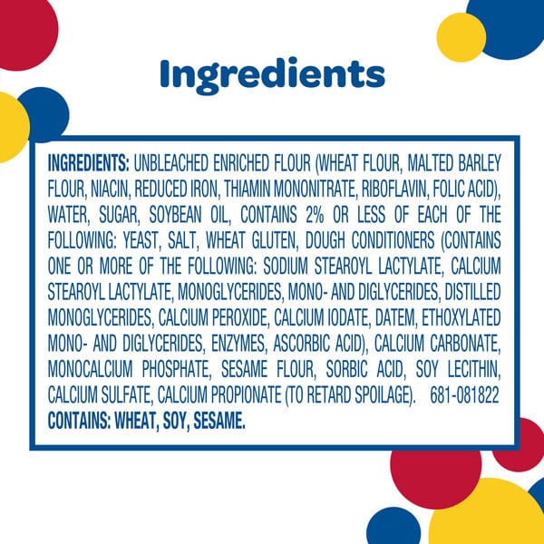 Unbleached Enriched Flour (wheat Flour, Malted Barley Flour, Niacin, Reduced Iron, Thiamin Mononitrate, Riboflavin, Folic Acid), Water, High Fructose Corn Syrup, Soybean Oil, Contains 2% Or Less Of Each Of The Following: Yeast, Salt, Wheat Gluten, Dough Conditioners (contains One Or More Of The Following: Sodium Stearoyl Lactylate, Calcium Stearoyl Lactylate, Monoglycerides, Mono- And Diglycerides, Distilled Monoglycerides, Calcium Peroxide, Calcium Iodate, Datem, Ethoxylated Mono- And Diglycerides, Enzymes, Ascorbic Acid), Soy Flour, Calcium Sulfate, Monocalcium Phosphate, Calcium Carbonate, Niacin, Reduced Iron, Thiamin Mononitrate, Riboflavin, Folic Acid, Calcium Propionate (to Retard Spoilage), If Seeded, Sesame Seeds Added