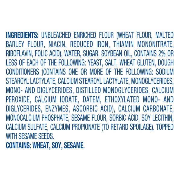 Unbleached Enriched Flour (Wheat Flour, Malted Barley Flour, Niacin, Reduced Iron, Thiamin Mononitrate, Riboflavin, Folic Acid), Water, Sugar, Soybean Oil, Contains 2% or Less of Each of the Following: Yeast, Salt, Wheat Gluten, Dough Conditioners (Contains One or More of the Following: Sodium Stearoyl Lactylate, Calcium Stearoyl Lactylate, Monoglycerides, Mono- and Diglycerides, Distilled Monoglycerides, Calcium Peroxide, Calcium Iodate, DATEM, Ethoxylated Mono- and Diglycerides, Enzymes, Ascorbic Acid), Calcium Carbonate, Monocalcium Phosphate, Sesame Flour, Sorbic Acid, Soy Lecithin, Calcium Sulfate, Calcium Propionate (to Retard Spoilage), Topped with Sesame Seeds.