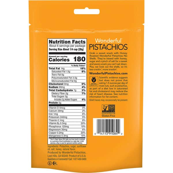 • SIZE: Net Wt 5.5 Ounce (155 g) No Shells – Our Wonderful Pistachios No Shells 5.5 Ounce makes a great on-the-go, healthy snack. Throw a bag in your bag for a deliciously fulfilling plant protein snack. See nutrition information for fat content.