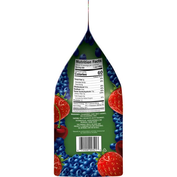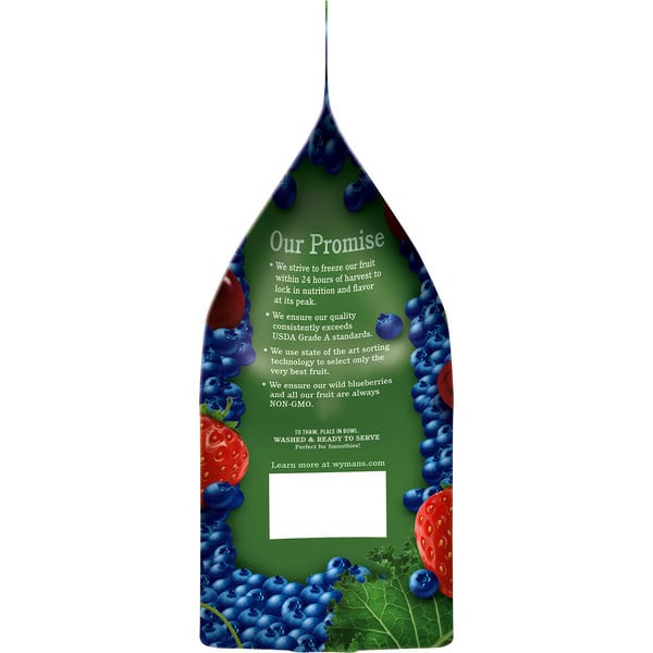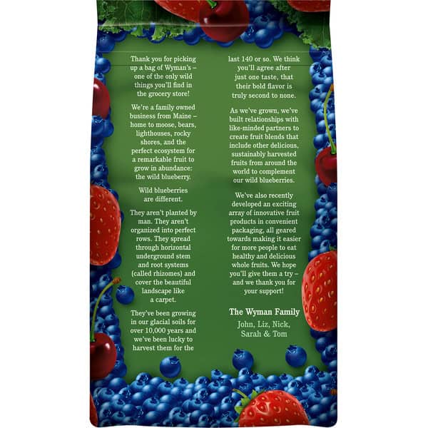 Nothing artificial. No preservatives. Family owned in Maine. Since 1874. Sustainably Harvested: Wild berries inside! Wild berries have up to 2x antioxidant activity compared to ordinary blueberries (Based on antioxidant activity measured by laboratory studies). See wymans.com for details. Thank you for picking up a bag of Wyman’s – one of the only wild things you’ll find in the grocery store! We’re a family owned business from Maine – home to moose, bears, lighthouses, rocky shores, and the perfect ecosystem for a remarkable fruit to grow in abundance: the wild blueberry. Wild blueberries are different. They aren’t planted by man. They aren’t organized into perfect rows. They spread through horizontal underground stem and root systems (called rhizomes) and cover the beautiful landscape like a carpet. They’ve been growing in our glacial soils for over 10,000 years and we’ve been lucky to harvest them for the last 140 or so. We think you’ll agree after just one taste, that their bold flavor is truly second to none. As we’ve grown, we’ve built relationships with like-minded partners to create fruit blends that include other delicious, sustainably harvested fruits from around the world to complement our wild blueberries. We’ve also recently developed an exciting array of innovative fruit products in convenient packaging, all geared towards making it easier for more people to eat healthy and delicious whole fruits. We hope you’ll give them a try- and we thank you for your support! The Wyman Family – John, Liz, Nick, Sarah & Tom. Our Promise: We strive to freeze our fruit within 24 hours of harvest to lock in nutrition and flavor at its peak. We ensure our quality consistently exceeds USDA Grade A standards. We use state of the art sorting technology to select only the very best fruit. We ensure our wild blueberries and all our fruit are always non-GMO. Washed & ready to serve.