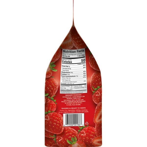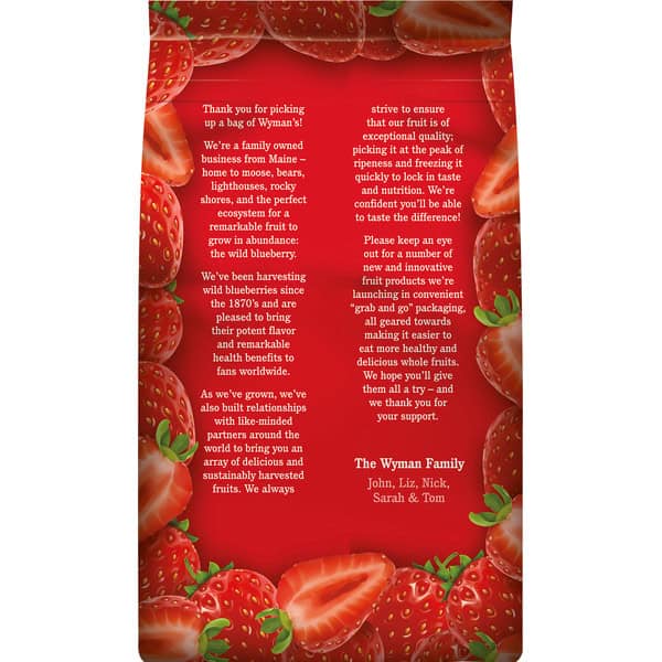 Rich in vitamin C. Nothing artificial. No preservatives. Family owned in Maine since 1874. 3 pounds. Thank you for picking up a bag of Wyman’s! We’re a family owned business from Maine – home to moose, bears, lighthouses, rocky shores, and the perfect ecosystem for a remarkable fruit to grow in abundance: the wild blueberry. We’ve been harvesting wild blueberries since the 1870’s and are pleased to bring their potent flavor and remarkable health benefits to fans worldwide. As we’ve grown, we’ve also built relationships with like-minded partners around the world to bring you an array of delicious and sustainably harvested fruits. We always strive to ensure that our fruit is of exceptional quality; picking it at the peak of ripeness and freezing it quickly to lock in taste and nutrition. We’re confident you’ll be able to taste the difference! Please keep an eye out of a number of new and innovative fruit products we’re launching it convenient grab and go packaging, all geared towards making it easier to eat more healthy and delicious whole fruits. We hope you’ll give them all a try – and we thank you for your support. – The Wyman Family John, Liz, Nick, Sarah & Tom. Our Promise: We strive to freeze our fruit within 24 hours of harvest to lock in nutrition and flavor at its peak. We ensure our quality consistently exceeds USDA Grade A standards. We use state of the art sorting technology to select only the very best fruit. We thoroughly wash all our fruit in a robust, effective, multi-stage process. We ensure our wild blueberries and all our fruit are always Non-GMO. Washed & ready to serve. Fun Fact: Wymans.com has a great selection of tasty recipes and ideas! Have you ever tried making your own strawberry jam or pie?
