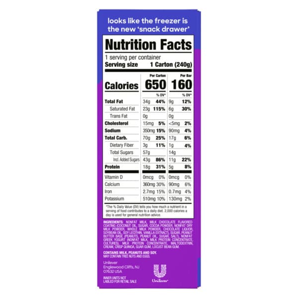 Nonfat Milk, Milk Chocolate Flavored Coating (coconut Oil*, Sugar*, Cocoa Powder*, Nonfat Dry Milk Powder, Whole Milk Powder, Chocolate Liquor, Soybean Oil*, Soy Lecithin*, Vanilla Extract*), Sugar, Peanut Butter Base (peanuts*, Peanut Oil*, Sugar*, Salt*) Greek Yogurt (nonfat Milk, Milk Protein Concentrate, Cultures), Milk Protein Concentrate, Maltodextrin*, Cream, Crisp Quinoa*, Guar Gum*, Locust Bean Gum*