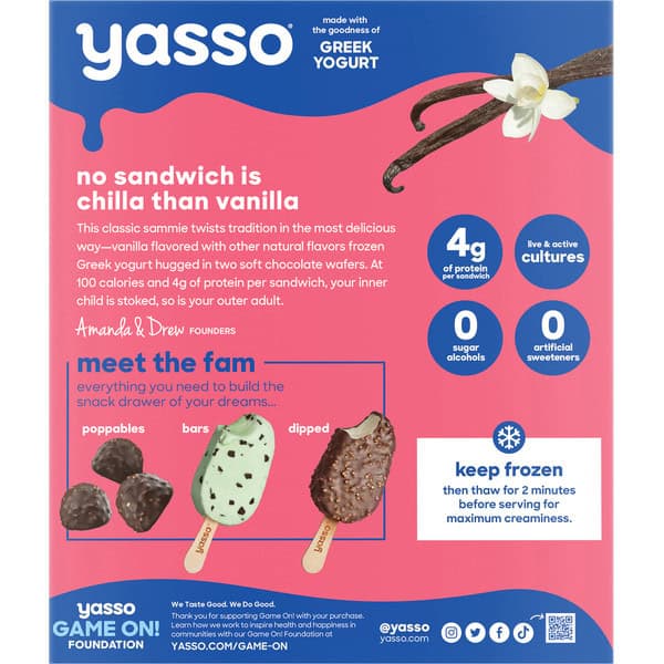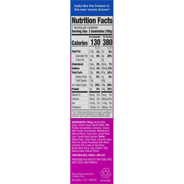 Filling: Nonfat Milk, Sugar, Greek Yogurt (nonfat Milk, Milk Protein Concentrate, Cultures), Cream, Milk Protein Concentrate, Maltodextrin, Natural Flavor, Guar Gum, Locust Bean Gum, Vanilla Bean Specks. Wafer: Wheat Flour, Cane Sugar, Caramel Color, Palm Oil, Cocoa Processed With Alkali, Contains 2% Or Less Of: Soy Flour, Brown Rice Syrup, Soy Lecithin, Salt, Baking Soda, Natural Flavor