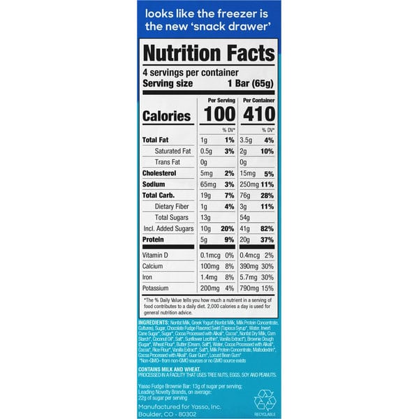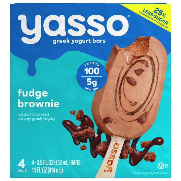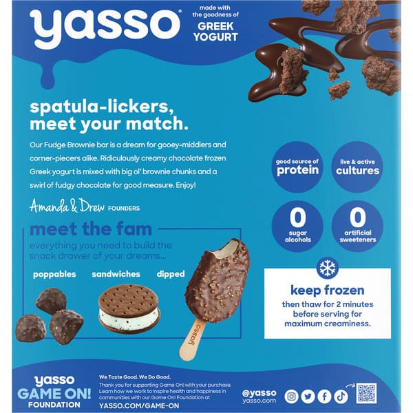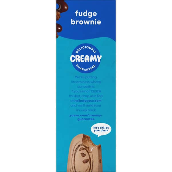 • Yasso Fudge Brownie Bars are made with ridiculously creamy chocolate Greek yogurt mixed with big ol’ brownie chunks and a swirl of chocolate fudge for good measure