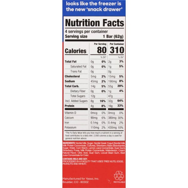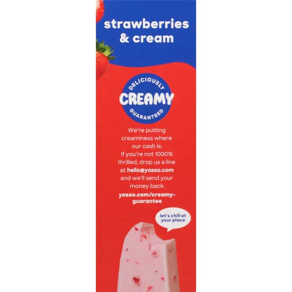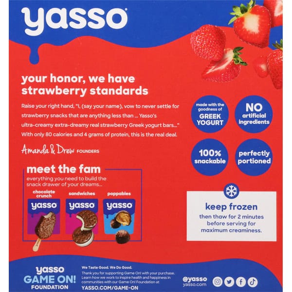 Your honor, we have strawberry standards. Raise your right hand, “i, (say your name), vow to never settle for strawberry snacks that are anything less than……. Yasso’s ultra-creamy extra-dreamy real strawberry greek yogurt bars…..” with 80 calories and 4 grams of protein per bar, and made with real fruit, this is the real deal. Crave this ridiculous creaminess. Check this real strawberry fruitiness. And get down with this goodness. All for 80 calories and 4g of protein, we’re on our berry best behavior. So snack on that! And consider us fruitarians. Yasso has changed the frozen snack game from the inside, taking ice cream’s delicious reputation and making it better with incredibly creamy frozen greek yogurt, and all the craveworthy flavors and fixings the freezer aisle can handle. So thanks for everything ice cream, but we’ll take it from here. If you’re looking for something that’s ridiculously creamy, insanely delicious and doesn’t leave you with all the guilt, greek yogurt is the whole package. Don’t believe us, believe your tastebuds. We may have given ice cream a much needed freezer-lift, but we left all the great flavors, cookie dough chunks, fudgy swirls and chocolate chips totally un-messed with. Yasso. Ridiculously better snacks.