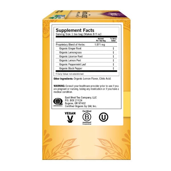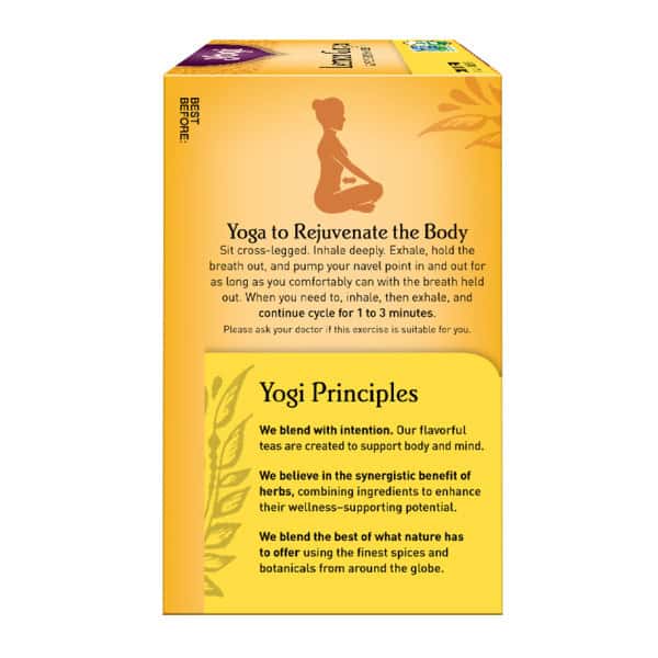 Yogi Lemon Ginger tea is a lively, herbal blend that combines tart Lemon and refreshing Peppermint with Ginger; used for centuries by Ayurveda practitioners for its warming properties and to aid healthy digestion. Enjoy a cup of Yogi Lemon Ginger tea when your tummy needs a little taming, or whenever you want to enjoy a deliciously flavorful herbal tea.* FLAVOR: Yogi Lemon Ginger tea combines lively Ginger, tart Lemon Peel, and Peppermint Leaf for a perfectly spiced and citrus-y blend BENEFITS: This warming herbal blend combines Ginger and Peppermint to soothe your stomach and support healthy digestion ORGANIC: USDA Certified Organic and Non-GMO Project Verified CONTENTS: Caffeine-free, Vegan, Kosher, Gluten-free, No Artificial Flavors or Sweeteners, and individually packaged in compostable tea bags DOING GOOD: Certified B Corp, member of Ethical Tea Partnership, with the first LEED-Certified tea production facility in the world. Organic farming practices and commitments to regenerative agriculture ensure that our teas are top quality while giving back to farmers and nature