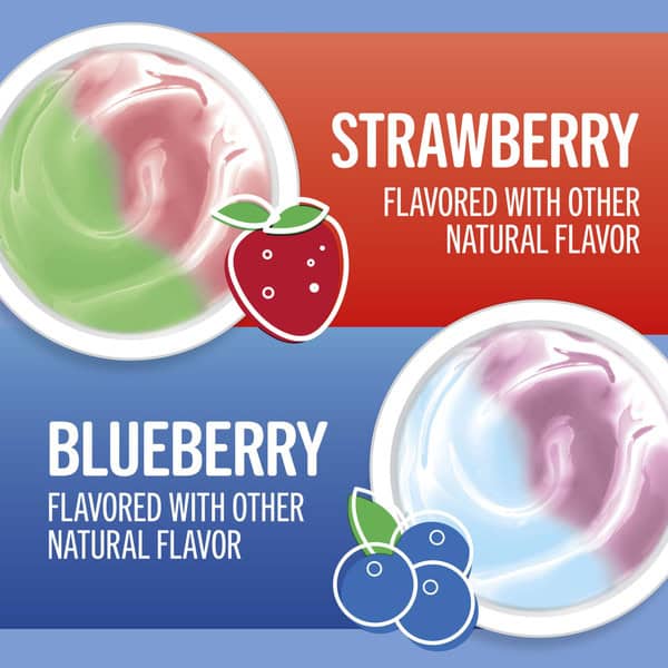 Strawberry: Cultured Grade A Low Fat Milk, Sugar, Modified Corn Starch. Contains 1% Or Less Of: Corn Starch, Fruit And Vegetable Juice (color), Natural Flavor, Potassium Sorbate Added To Maintain Freshness, Spirulina Extract (color), Beta Carotene (color), Turmeric Oleoresin (color), Vitamin A Acetate, Vitamin D₃, Blueberry: Cultured Grade A Low Fat Milk, Sugar, Modified Corn Starch. Contains 1% Or Less Of: Corn Starch, Fruit And Vegetable Juice (color), Potassium Sorbate Added To Maintain Freshness, Natural Flavor, Spirulina Extract (color), Vitamin A Acetate, Vitamin D₃