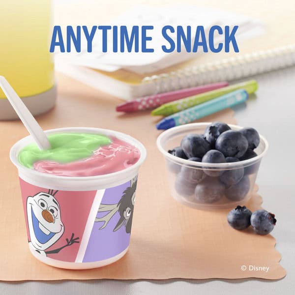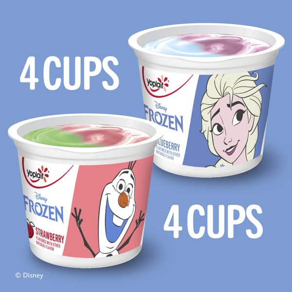 • DISNEY FROZEN: Creamy strawberry flavored and blueberry flavored low fat yogurt brings the magic of Disney Frozen to kids snack time; Snack cups feature characters Olaf, Sven, Anna, and Elsa