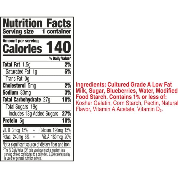 Cultured Grade A Low Fat Milk, Sugar, Blueberries, Water, Modified Food Starch, Contains 1% Or Less Of: Corn Starch, Tricalcium Phosphate, Pectin, Natural Flavor, Kosher Gelatin, Vitamin A Acetate, Vitamin D₃