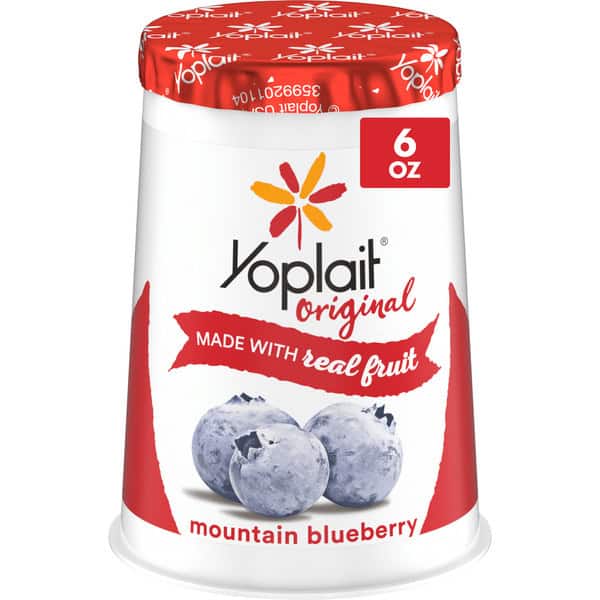 • CONTAINS: One 6 oz yogurt cup of Yoplait Original Mountain Blueberry Low Fat Yogurt