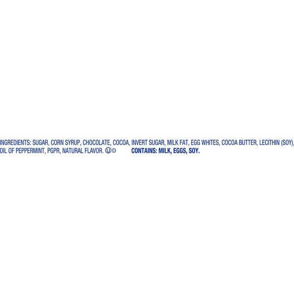 Sugar, Corn Syrup, Chocolate, Cocoa, Invert Sugar, Milk Fat, Egg Whites, Cocoa Butter, Lecithin (soy) Oil Of Peppermint, Pgpr, Natural Flavor. Ud Contains: Milk, Eggs, Soy.