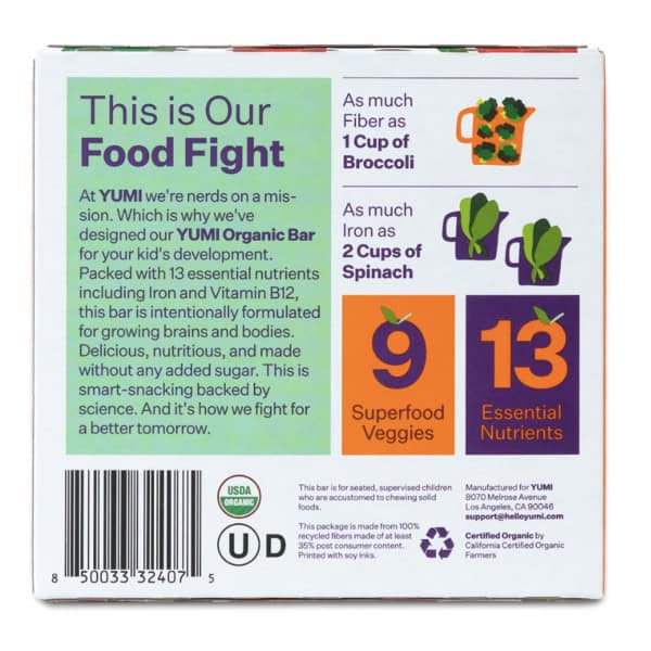 Crust: Organic Oat Flour, Organic Date Paste, Organic Inulin, Organic Coconut Oil, Baking Soda, Organic Cinnamon, Organic French Vanilla Flavor, Organic Rosemary Extract Filling: Organic Tapioca Fiber Syrup, Organic Evaporated Apples, Water, Organic Banana Puree, Organic Glycerin, Organic Bluberries, Organic Corn Starch, Organic Purple Carrot Puree, Organic Monk Fruit Concentrate, Citric Acid, Organic Natural Flavor, Yumi Superfood Blend (broccoli, Spinach, Kale, Pumpkin, Sweet Potato, Sunflower Seed, Cranberry, Chlorella, Maitake Mushroom, Shiitake Mushroom), Organic Fruit Juice For Color