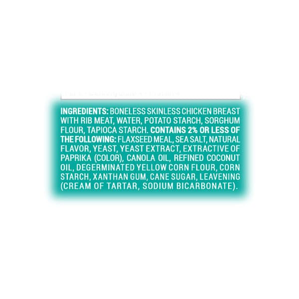 Boneless Skinless Chicken Breast With Rib Meat, Water, Potato Starch, Sorghum Flour, Tapioca Starch. Contains 2% Or Less Of The Following: Flaxseed Meal, Sea Salt, Natural Flavor, Yeast, Yeast Extract, Extractive Of Paprika (color), Canola Oil, Refined Coconut Oil, Degerminated Yellow Corn Flour, Corn Starch, Xanthan Gum, Cane Sugar, Leavening (cream Of Tartar, Sodium Bicarbonate).