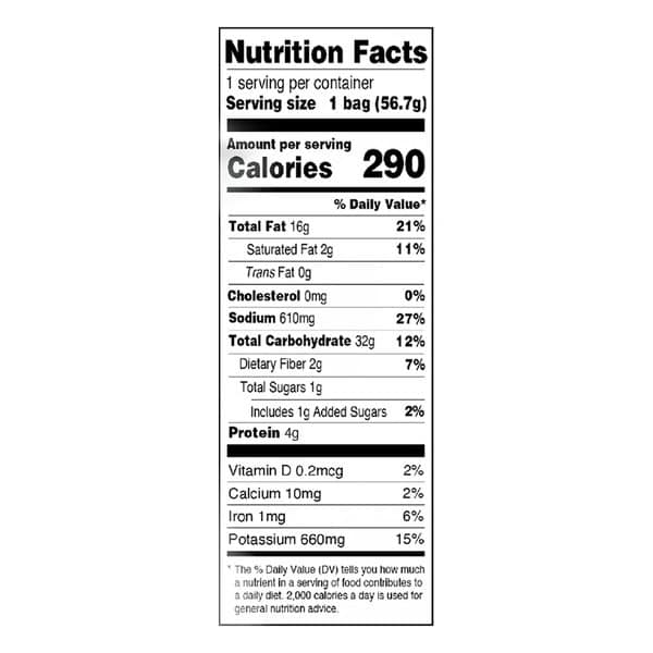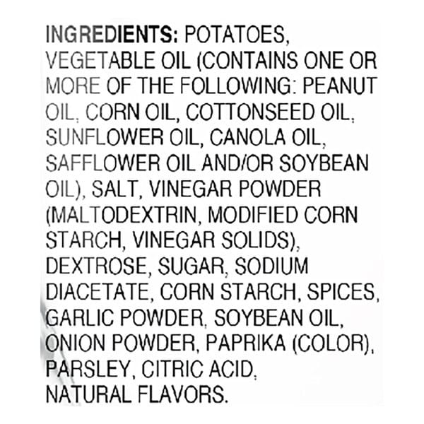 Potatoes, Peanut Oil Or A Blend Of Peanut Oil, And Canola Oil, Corn Oil, Or Sunflower Oil, Salt, Vinegar Powder (maltodextrin, Modified Corn Starch, Vinegar Solids), Dextrose, Sugar, Sodium Diacetate, Corn Starch, Spices, Garlic Powder, Soybean Oil, Onion Powder, Paprika (color), Parsley, Citric Acid, Natural Flavors.