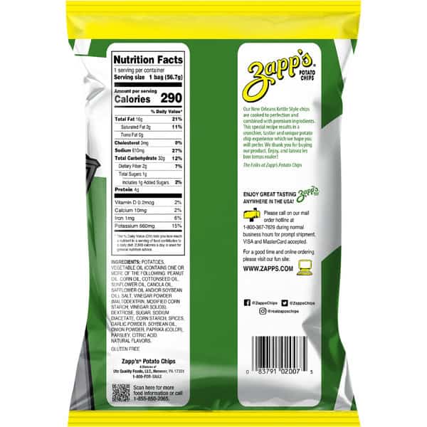 Zapp’s® New Orleans Kettle Style Potato Chips Cajun Dill Gator-Tatorsâ„¢. These potato chips are kettle cooked, one batch at a time. This process, combined with premium ingredients, results in a crunchier, tastier potato chip which we hope you will prefer. Enjoy great tasting Zapp’s. It is free from gluten.