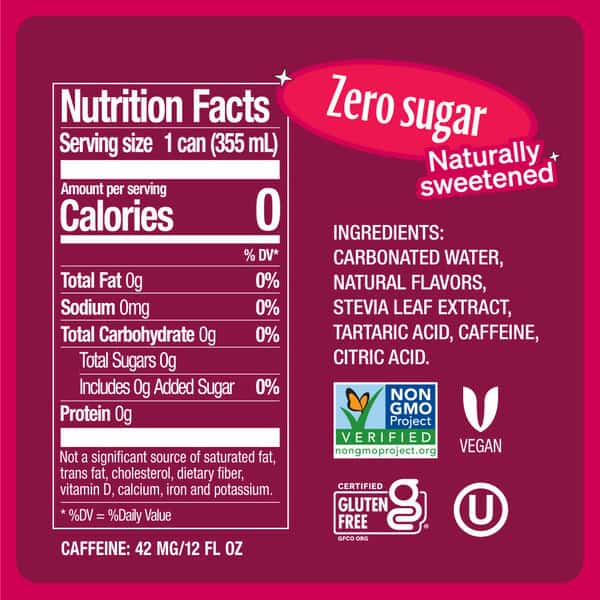 Carbonated Water, Natural Flavors, Stevia Leaf Extract, Tartaric Acid, Caffeine, Citric Acid.