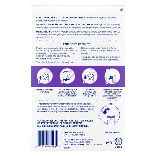 1. Remove refill from trap. 2. Peel off backing in a continuous motion where it says pull here, and discard. 3. Replace refill into trap by sliding into position. 4. Plug the trap into an indoor electrical outlet. For best performance, keep plugged in. Trap rotates 90 degrees for your convenience. To rotate the plug, hold the front of the unit upright in one hand, grasp both metal plug blades in the other hand and rotate these blades about the center of the plug to which the blades are mounted. For Best Results: Place traps in outlets that are easily accessed by flying insects and close to where you commonly see them. If not enough insects are captured, try changing the location. The blue light indicates it’s working. Replace refill cartridge when it is full of insects. Check it every 15 days or as needed. This package contains one cartridge. Refill cartridges are sold separately.